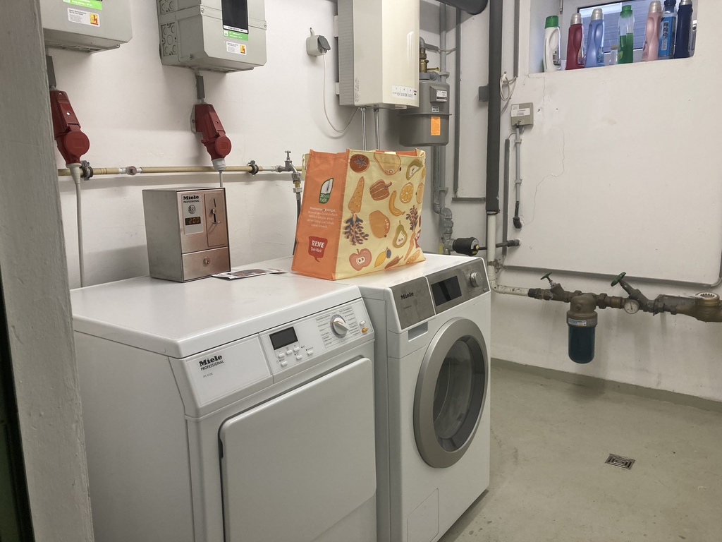 Wäschekeller mit Münzwaschmaschine und Münzwäschetrockner.